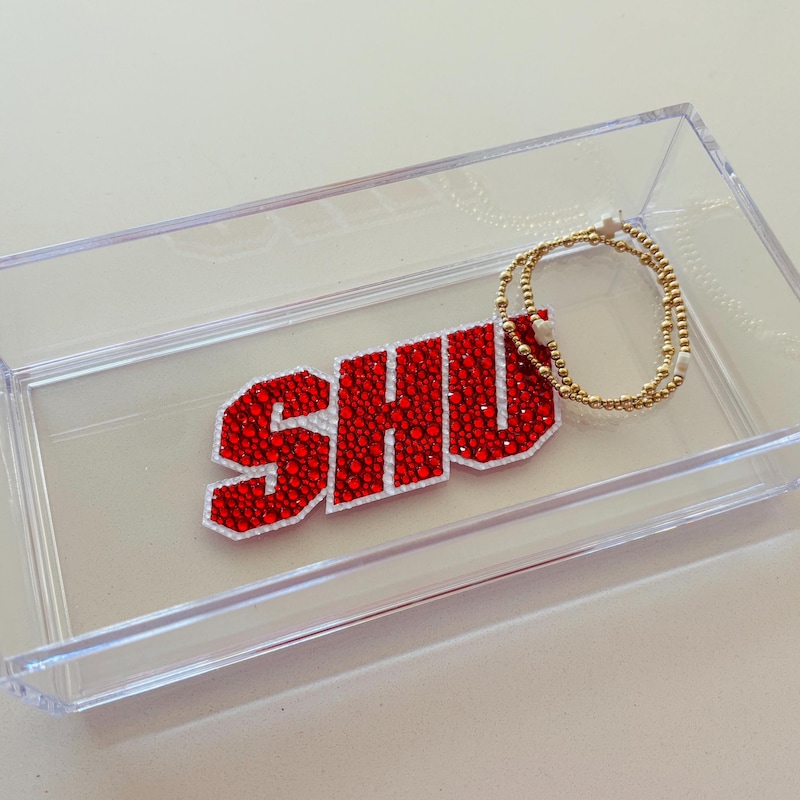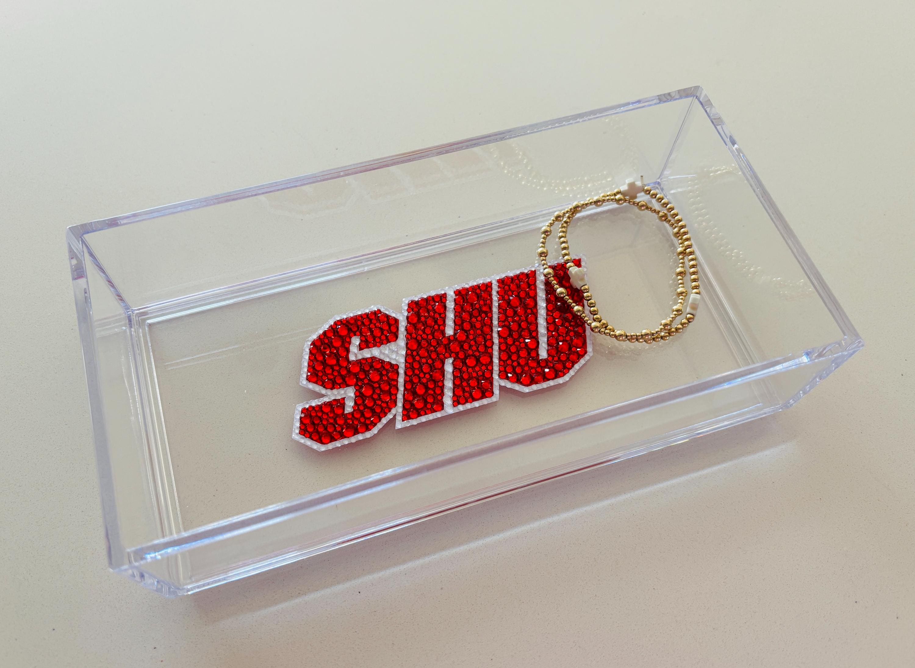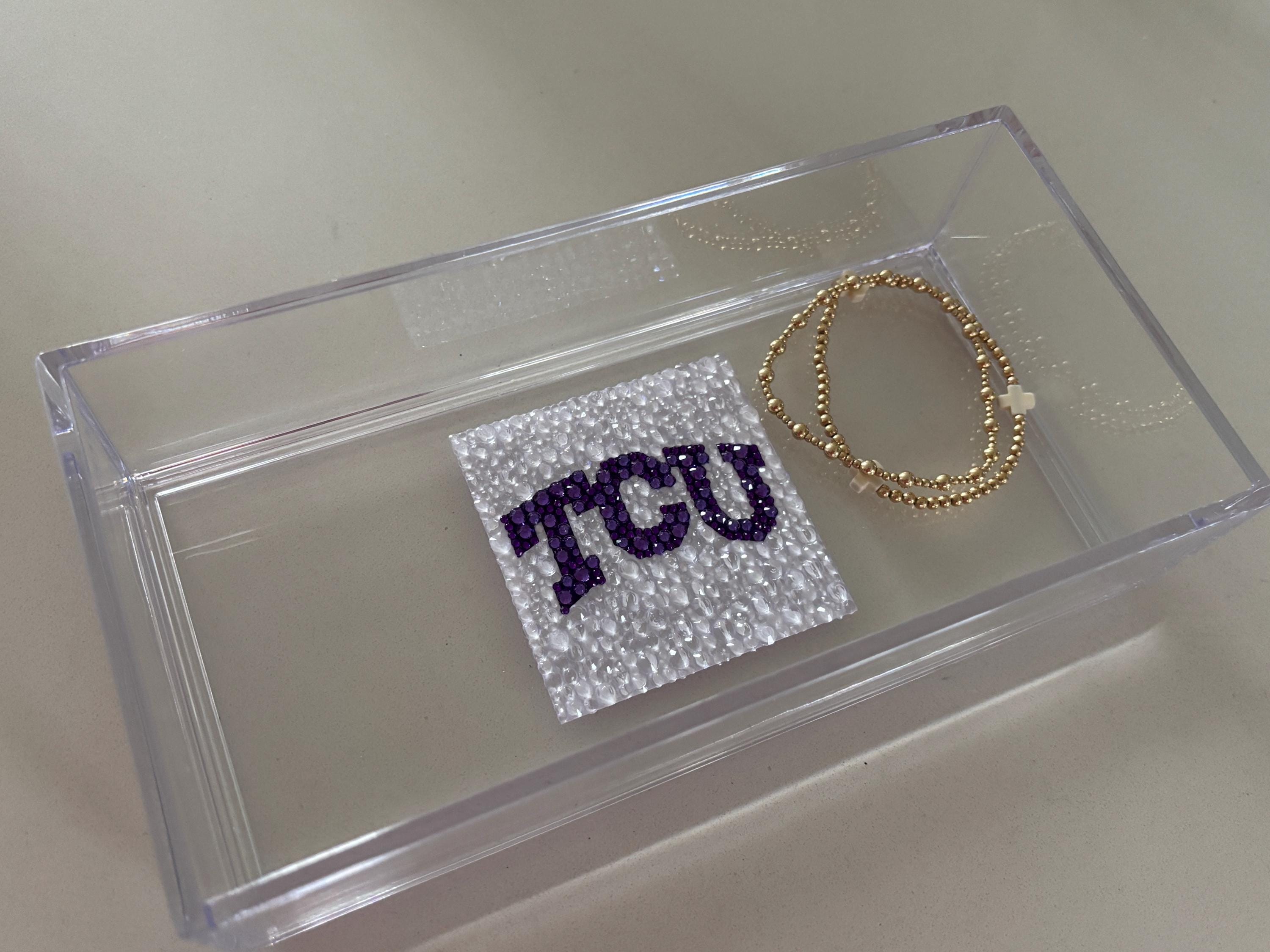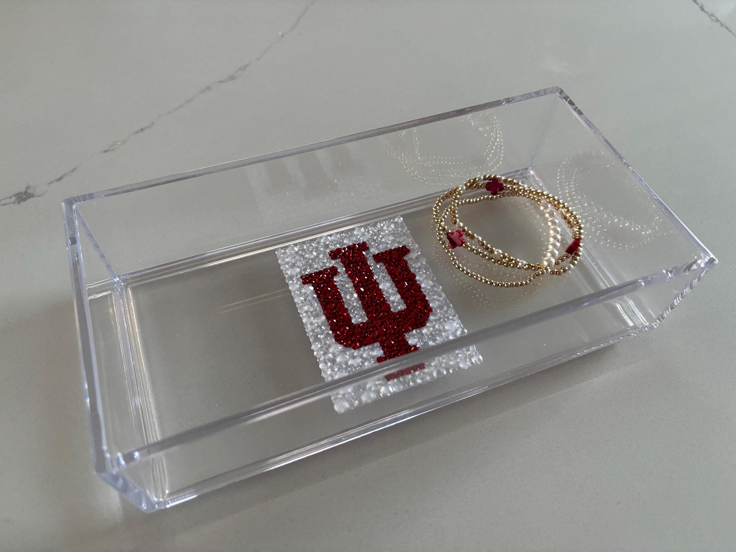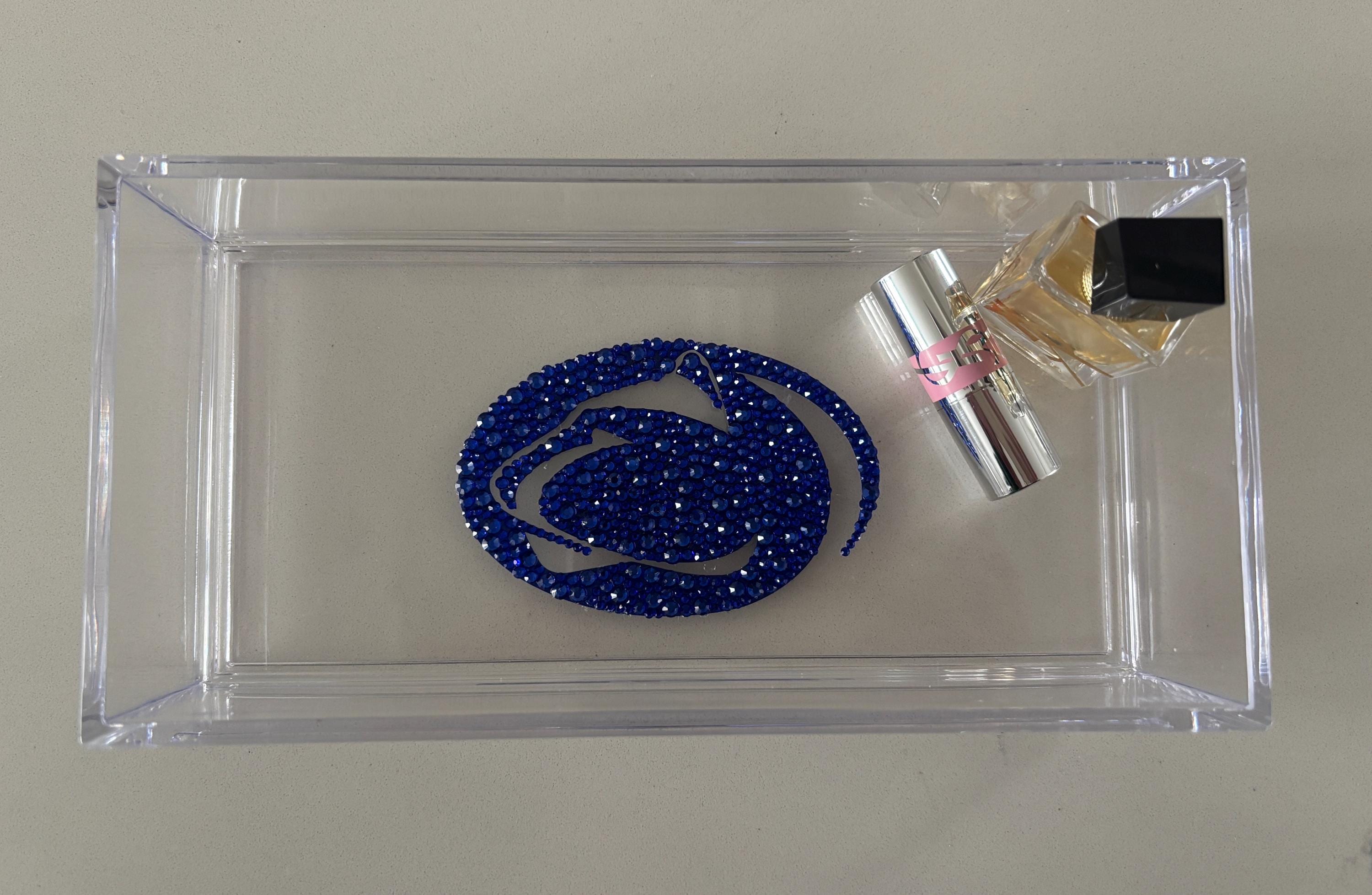 Custom college acrylic tray made with rhinestones. This college tray makes for the perfect graduation gift, college acceptance or college student dorm decor. The acrylic tray is 8x4x2 and is great for holding small items like keys, AirPods or jewelry.