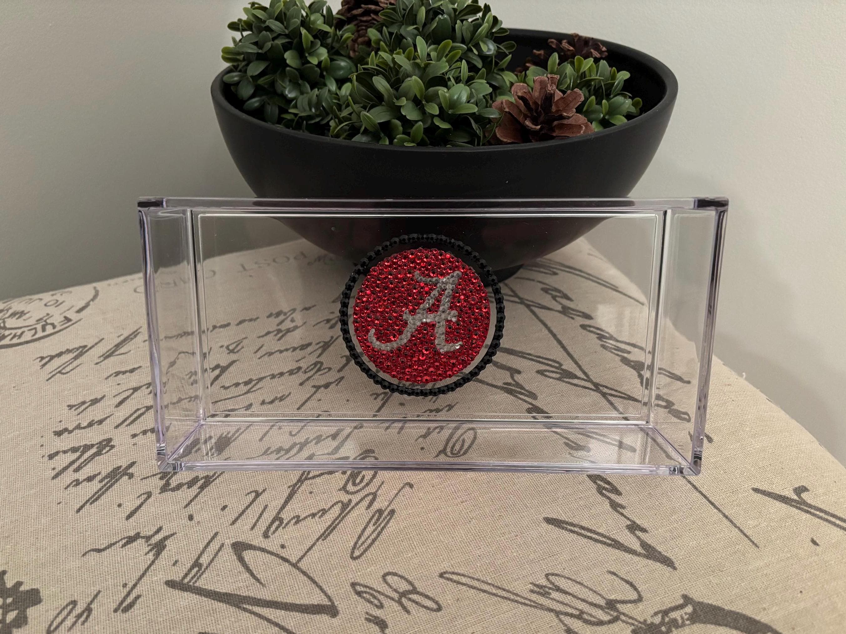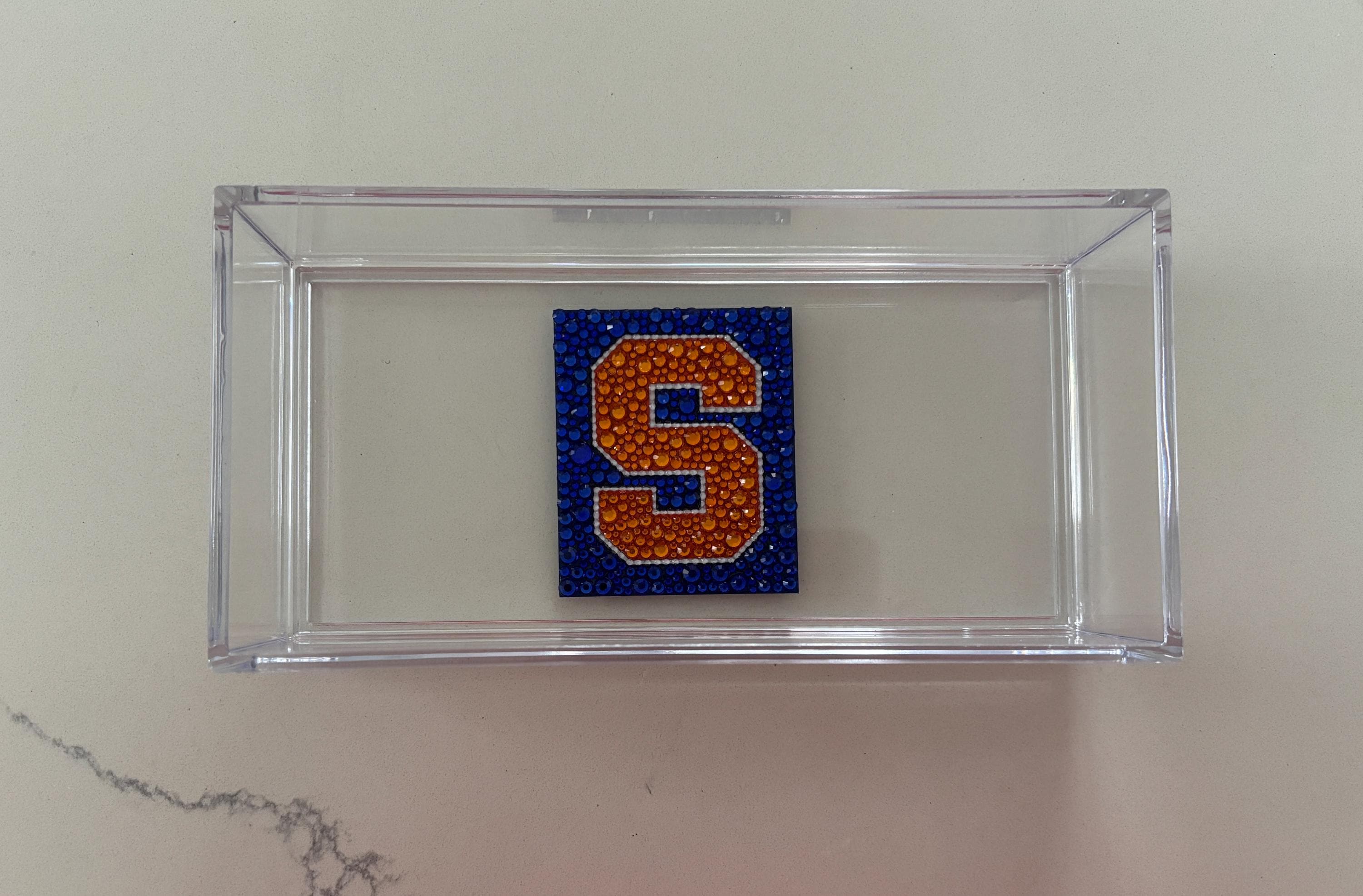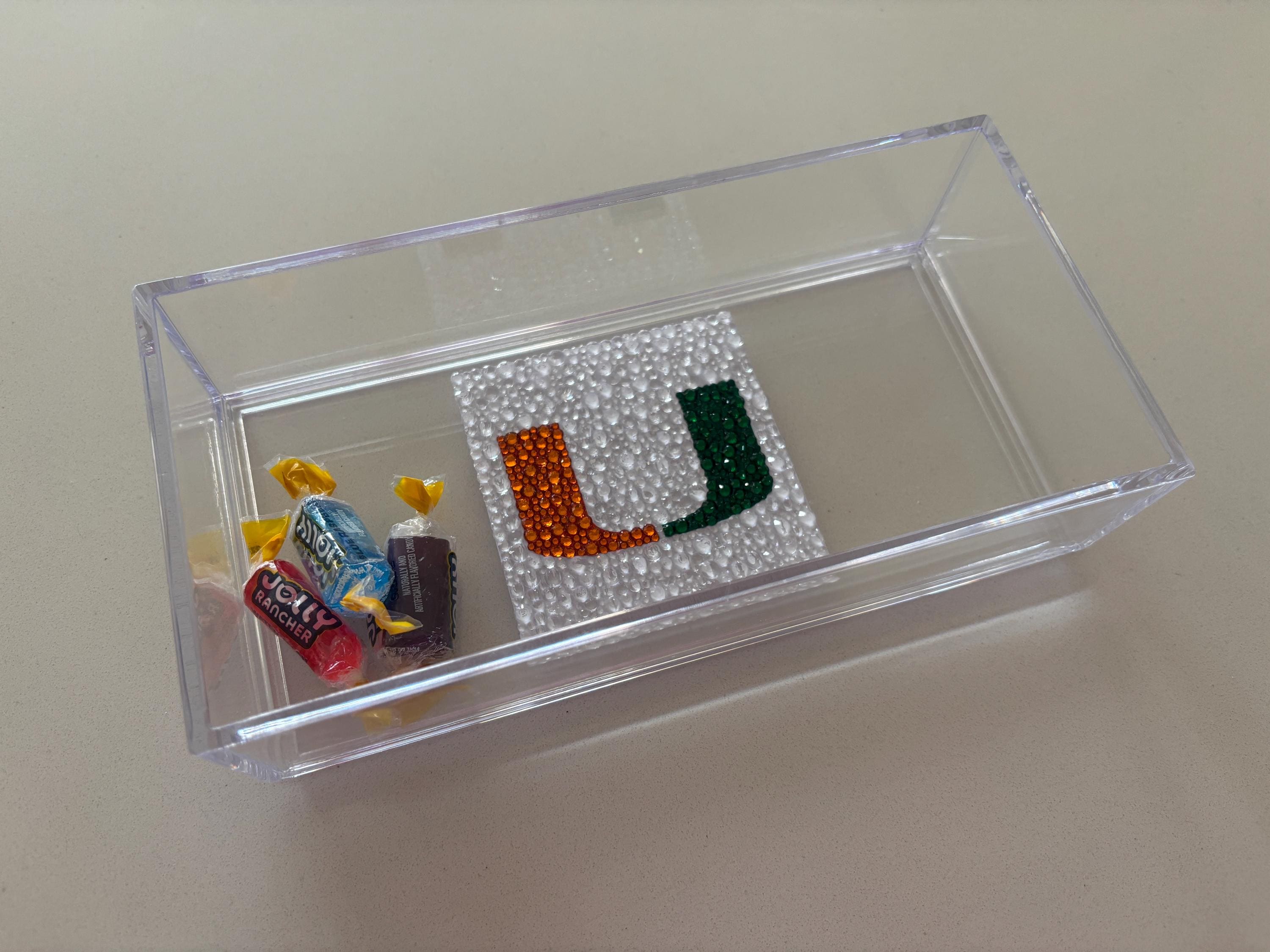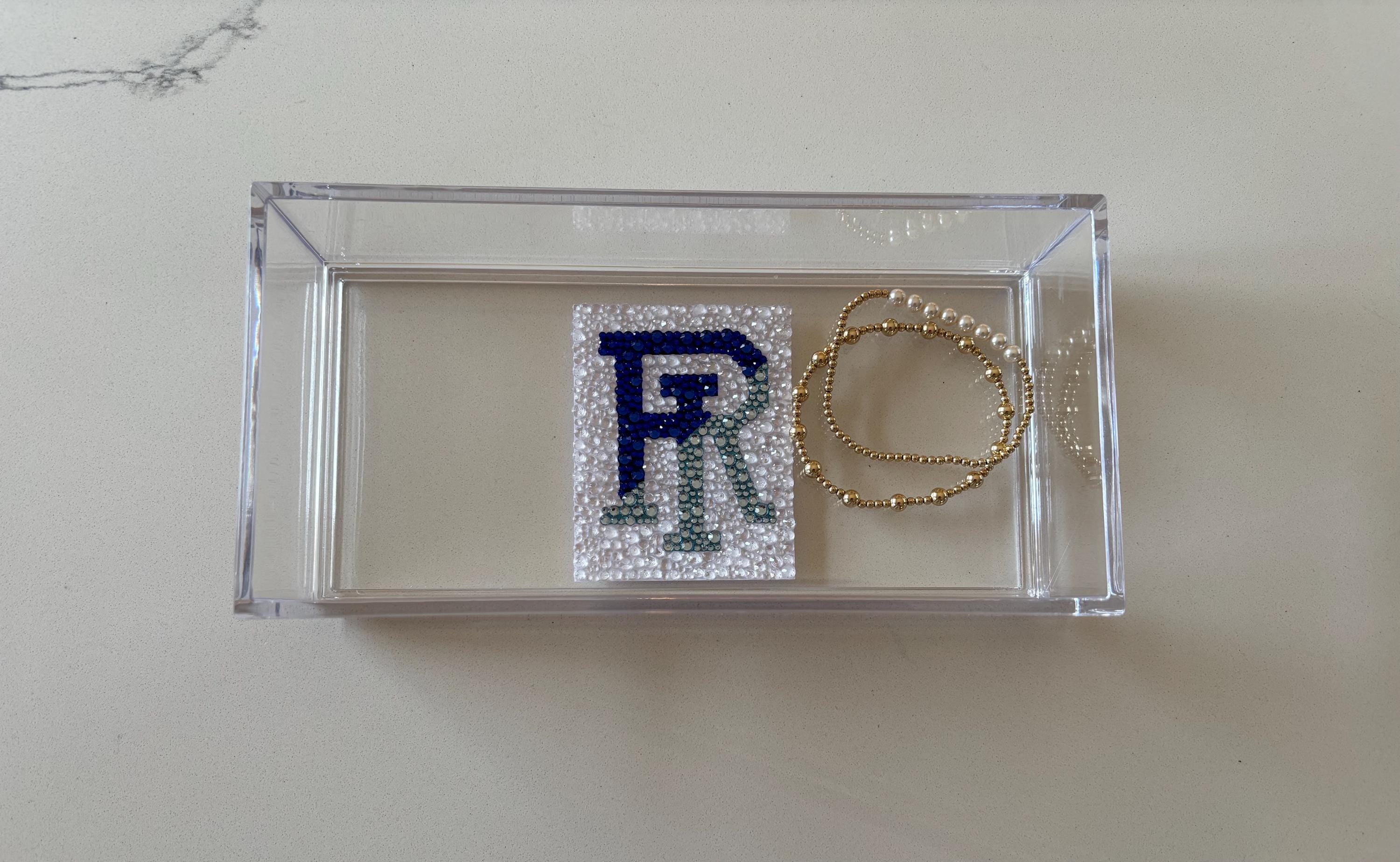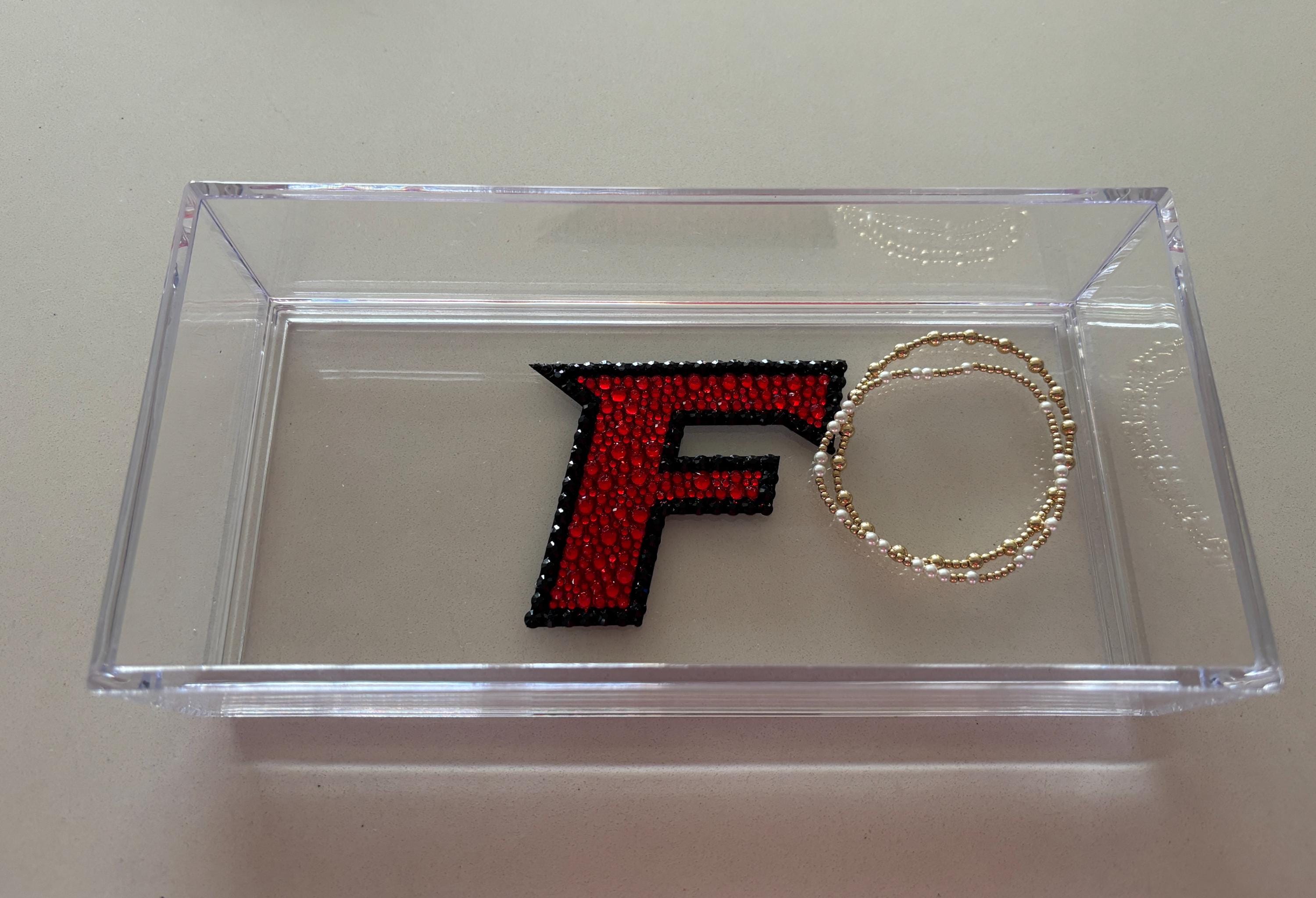 Custom college acrylic tray made with rhinestones. This college tray makes for the perfect graduation gift, college acceptance or college student dorm decor. The acrylic tray is 8x4x2 and is great for holding small items like keys, AirPods or jewelry.